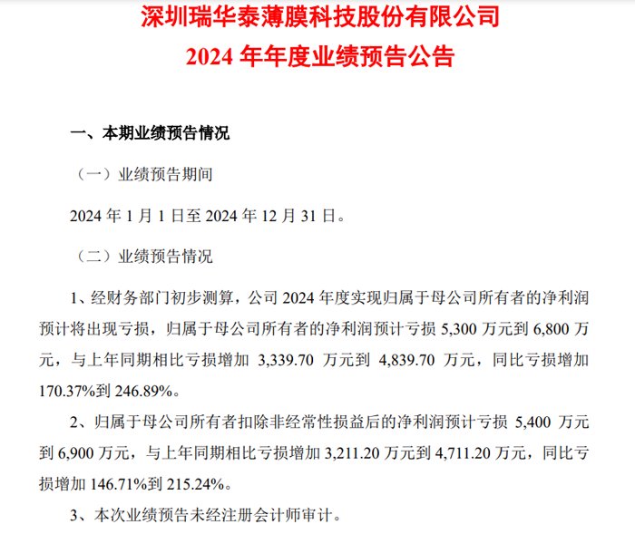 1月17日晚间,深圳瑞华泰薄膜科技股份有限公司发布2024年年度业绩预告 ,预计实现营业收入 33,000 万元到 35,000 万元,同比上年增长19.60%-26.84%。