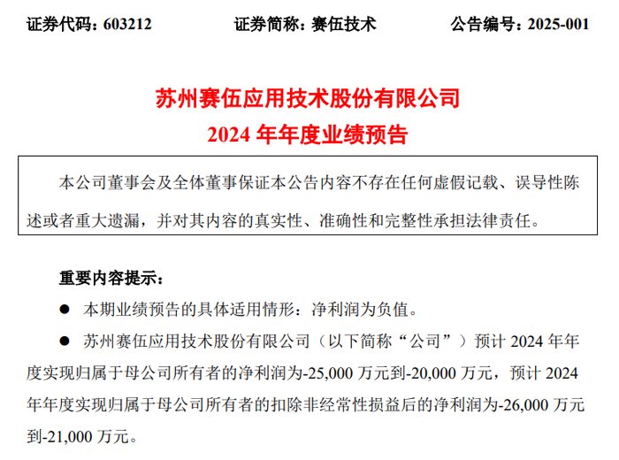 1月17日,苏州赛伍应用技术股份有限公司发布2024 年年度业绩预告 ,预计 2024 年年度实现归属于母公司所有者的净利润为-25,000 万元到-20,000 万元,与上年同期(法定披露数据)相比,将出现亏损。