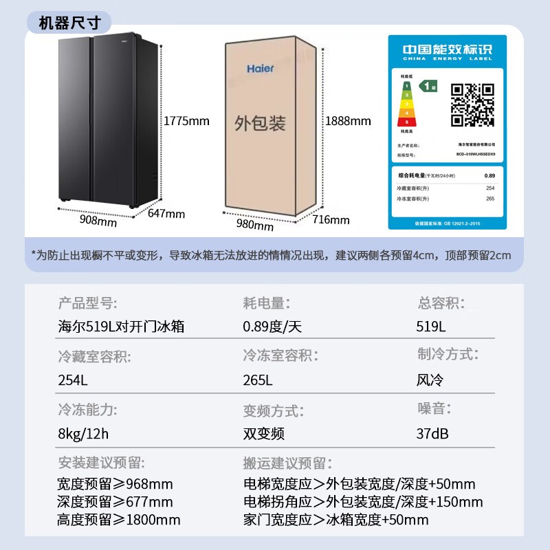 海尔Haier BCD-519WLHSSEDX9双门对开门冰箱只要2869元