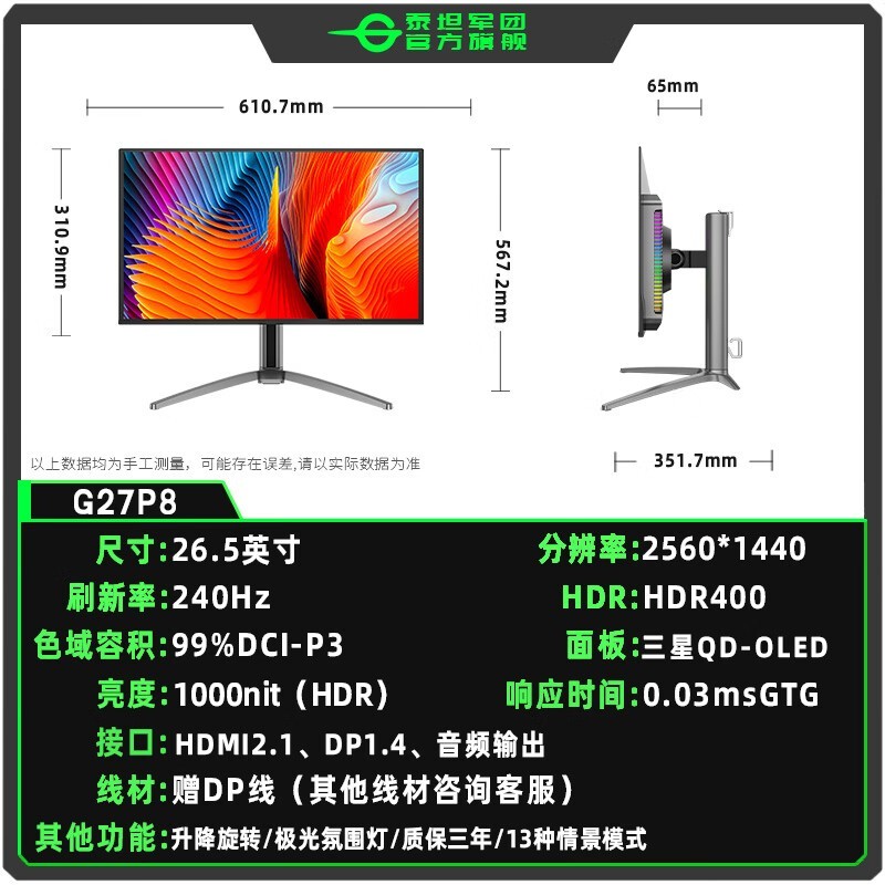 泰坦军团QD-OLED电竞显示器27英寸G27P8到手价2999元