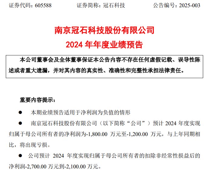 1月17日晚间,南京冠石科技股份有限公司发布2024 年年度业绩预告 ,预计 2024 年度实现归属于母公司所有者的净利润-1,800.00 万元到-1,200.00 万元,与上年同期相比,将出现亏损。