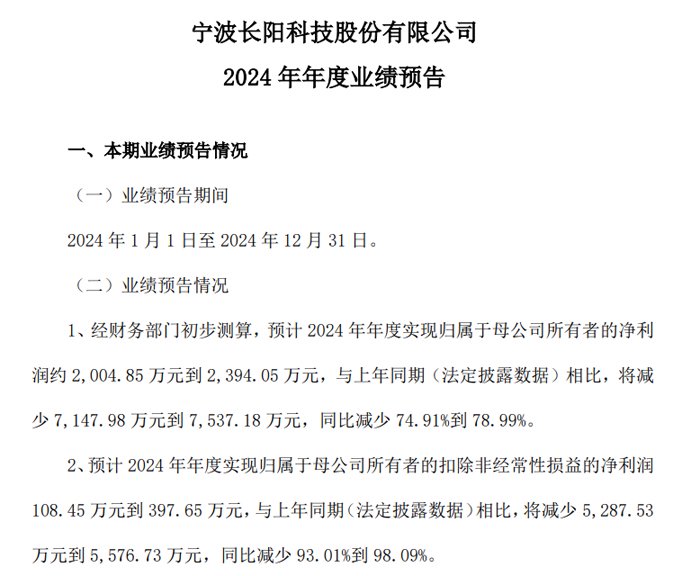 1月17日晚间,宁波长阳科技股份有限公司发布2024 年年度业绩预告,预计 2024 年年度实现归属于母公司所有者的净利润约 2,004.85 万元到 2,394.05 万元,与上年同期(法定披露数据)相比,将减少 7,147.98 万元到 7,537.18 万元,同比减少 74.91%到 78.99%。
