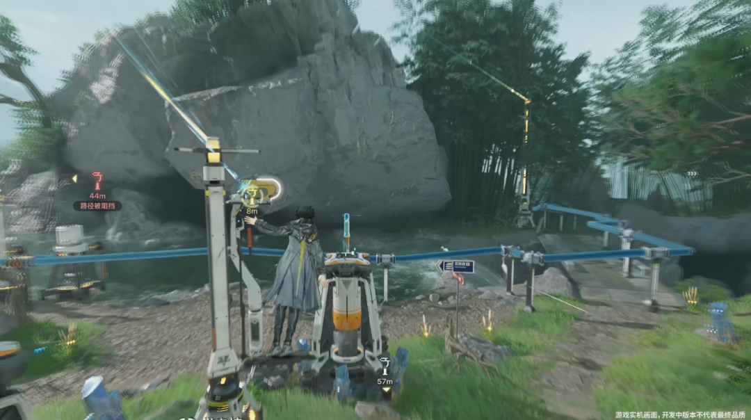 再以宏山场景为例,你会发现地形充满了高低差和可解锁单向门(也是地图解谜的一部分),在主线来回跑图的过程中,不停有视觉重心引导我在某些地方尝试铺设供电桩和滑索,避免进一步的跋山涉水,减少后续的工作成本。