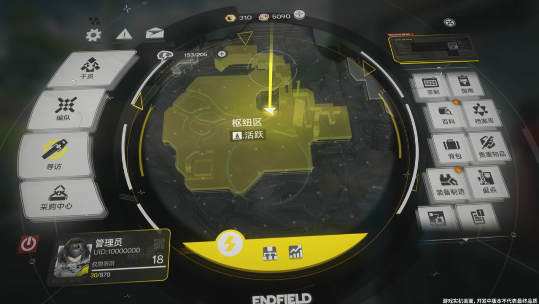 这种“语言统一”,几乎覆盖了终末地中你能交互的每一个界面和按钮。比如技术测试里已经受到玩家好评的主菜单界面,用高度简洁凝练的拟物质感,营造出了一种工业控制面板的科技气息,更突出了剧情背景下的“终末地工业风”。