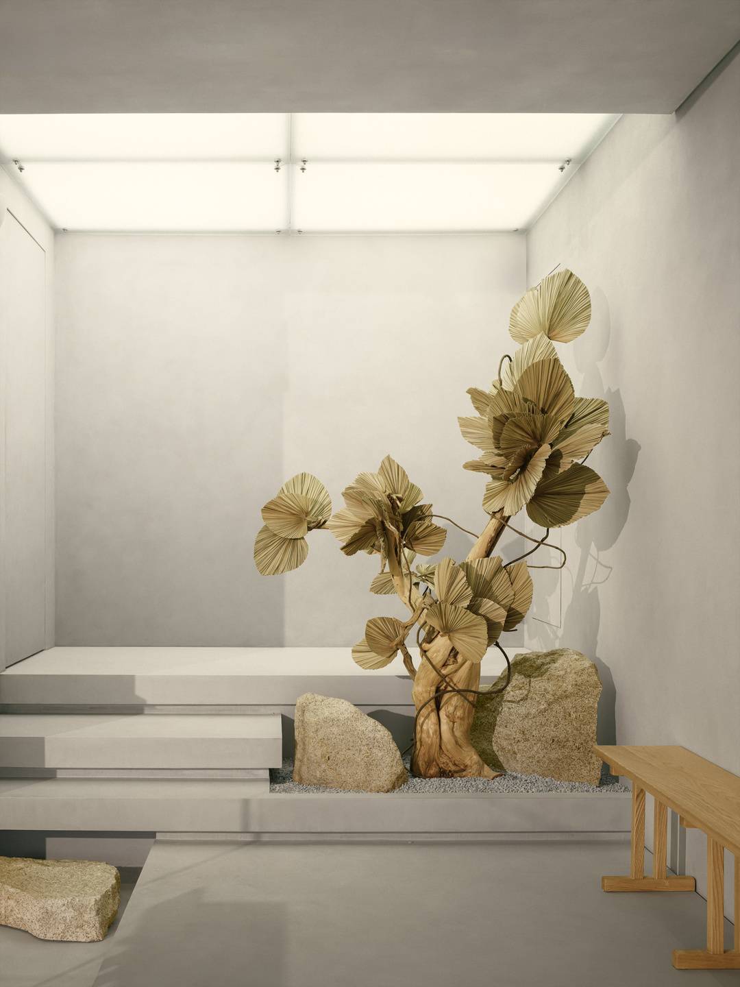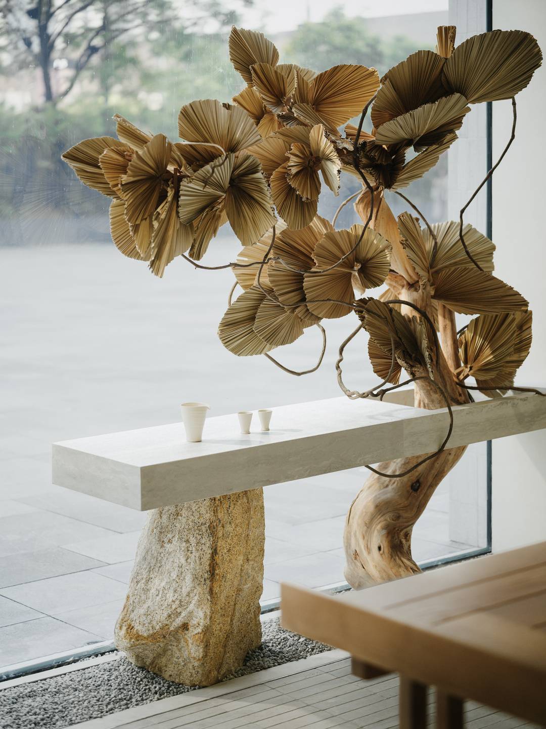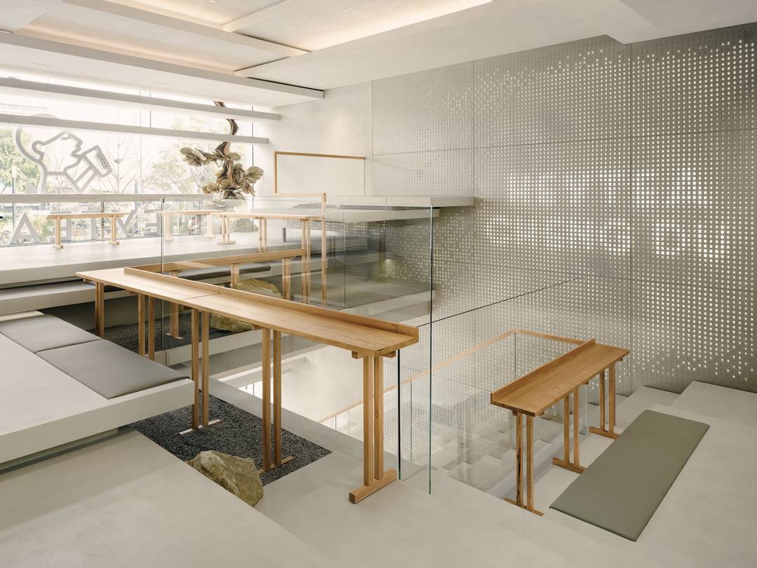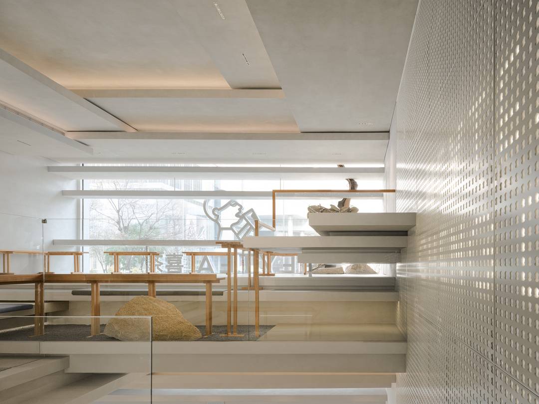 入店沿阶而上,步步递进,不同的茶事空间交错重叠,移步换景之间打开了社交的不同可能,每一处角落都可以成为互动、交流的场所,营造出一个模拟院坝的邻里环境。在院坝式社交的热闹喧嚣中,喜茶以克制冷静的浅灰微水泥墙面搭配原木装饰,在一冷一暖之间,又赋予空间通透平和、温暖明亮的氛围。加之特别定制的崖柏与蒲葵等静物点缀其中,在一进一景一茶一物之间,共同形成了「叠院」空间的禅意美学。