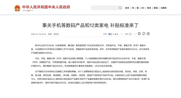 这次针对手机手表平板的国补,将在 1 月 20 号,也就是下周一正式开始,大部分地区的补贴将会持续到年底。