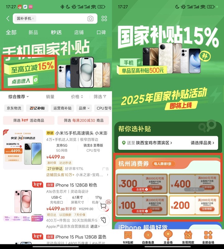不过有些地区除了有国补,还会有单独的优惠政策,例如在京东国补界面,还可以领取全国通用的「杭州消费券」。