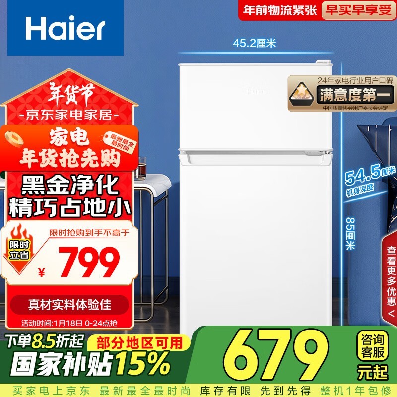 海尔小户型节能电冰箱:50cm超薄设计,64L大容量,799元净味除菌租房神器