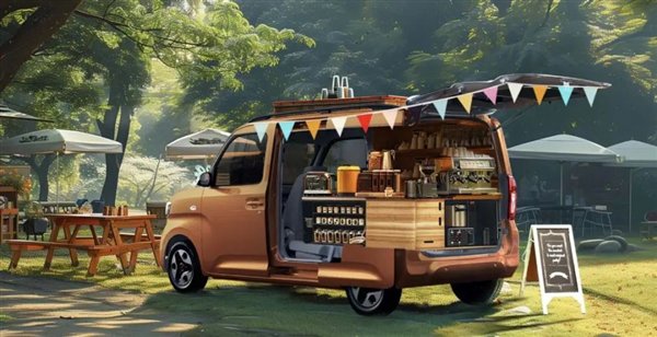 车尾尾门方正,开启高度超过1.8m,尾门开启角度接近90°,满足的场景不少,比如卖甜品卖咖啡,或者开一个移动花店或者移动餐厅都不是问题。