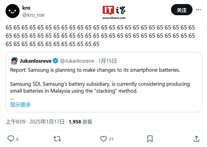 1 月 18 日消息,科技媒体 sammyguru 昨日(1 月 17 日)发布博文,报道称三星终于决定推进 Galaxy 手机快充,内部正研发 65W 有线快充方案,最快在 Galaxy S26 系列手机中部署。