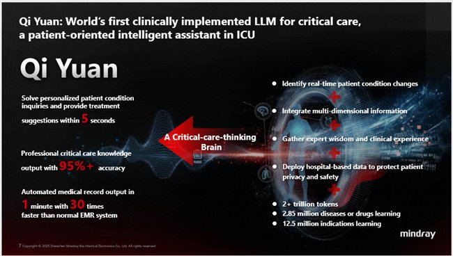 2024年12月,迈瑞医疗推出全球首个在重症监护领域临床应用的大模型——“启元”。借助物联网、云计算、大数据与人工智能技术的深度融合,启元重症大模型能够提供准确率高达95%的重症知识查询结果,基于数据还原患者数字画像,以重症思维展开深度分析,在5秒内为医护人员回溯整合患者病情、基于患者数字画像预测趋势并提供建议,1分钟生成临床思维导向下的病历文档,助力临床全面提升诊疗精准度与质量。