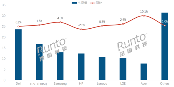 三星、惠普、联想、LG等品牌分列其后,出货量均突破千万台大关,同比增长率介于0.7%至4.0%之间。