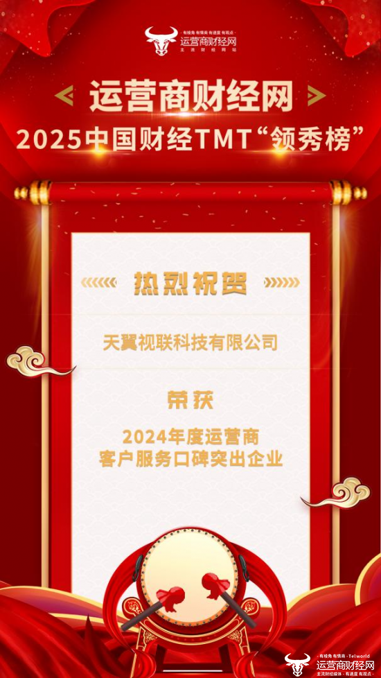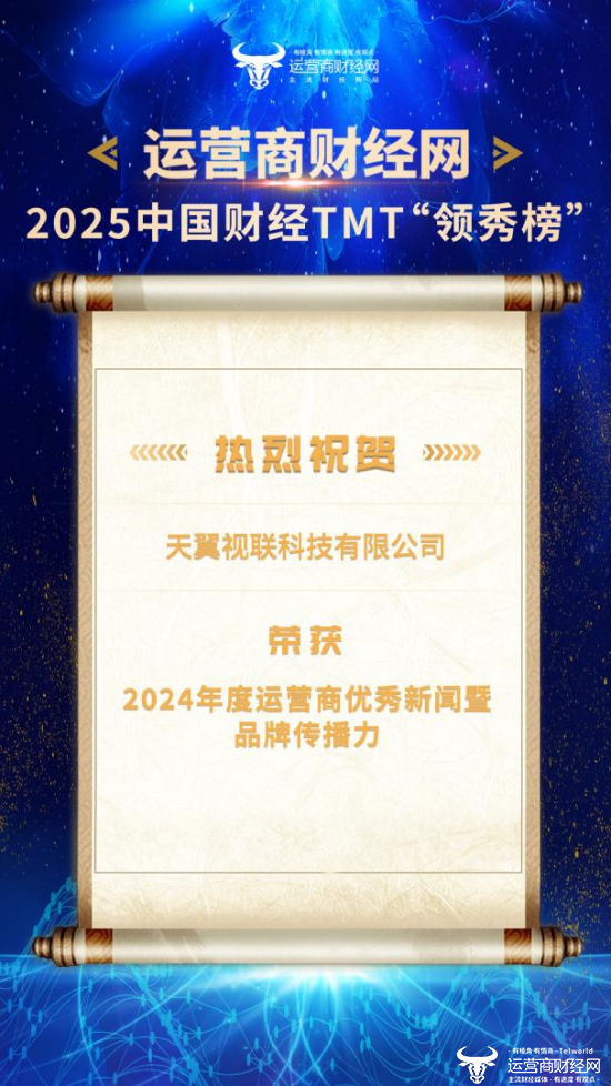 1月16日,2025中国财经TMT“领秀榜”盛典隆重举办,盛典上,运营商财经网对过去一年表现优异的企业进行颁奖。其中,天翼视联科技有限公司(简称“天翼视联”)荣获“2024年度运营商优秀新闻暨品牌传播力”、“2024年度运营商科技创新引领企业”、“2024年度运营商客户服务口碑突出企业”等奖项。