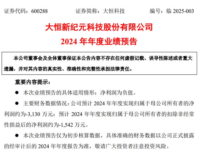 1月18日,大恒新纪元科技股份有限公司发布2024 年度业绩预告,预计 2024 年年度实现归母净利润约为亏损3,130 万元,与上年同期相比,将出现亏损。预计 2024 年年度实现扣非净利润约为-1,542 万元。