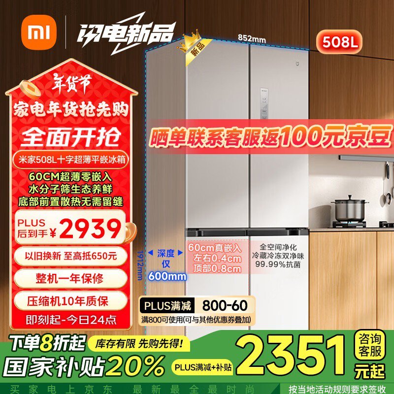 米家对开门冰箱2031元 限时特惠10年质保