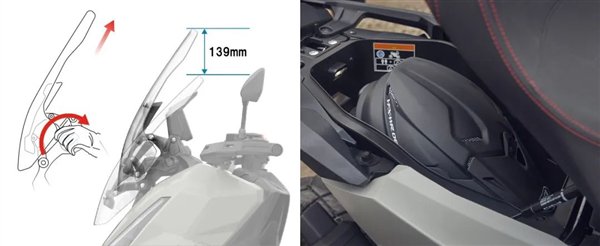 风挡最低位到最高位可调范围为139mm,且单手就能调节,而坐垫下的收纳空间达到了22L之多,收纳空间内配置了高亮度照明灯与USB接口,夜间使用也很方便。