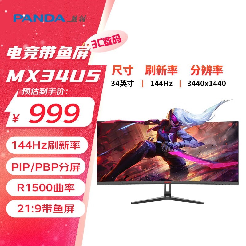 熊猫34英寸电竞带鱼显示器999元秒杀!