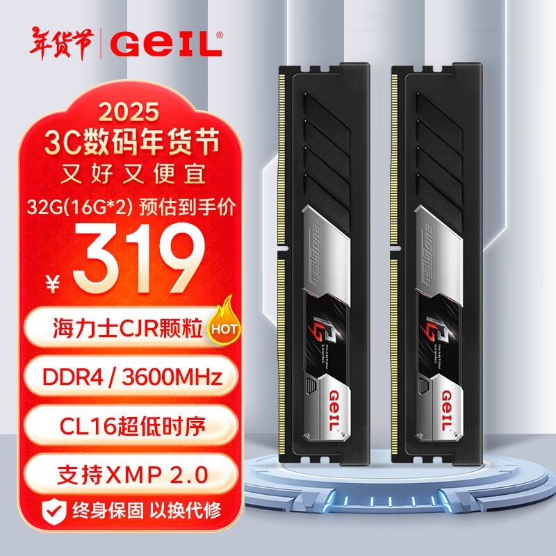 金邦GeIL DDR4 3600台式机电脑内存条319元 包邮
