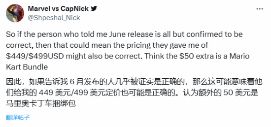 Shpeshal_Nick表示,Switch 2将于2025年6月发布,并有两个定价选项:一个为基础版,定价449美元,还有另一个包含预告片中提到的新《马里奥赛车》游戏的捆绑版,定价499美元。