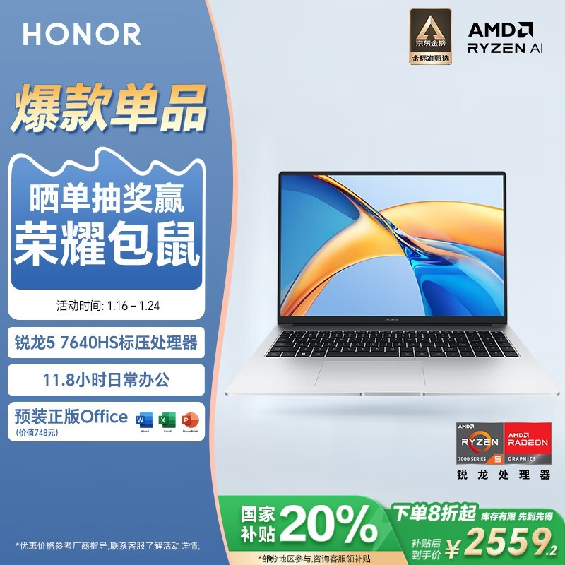 荣耀笔记本X16锐龙版优惠抢购中 原价2999到手低至2546元!