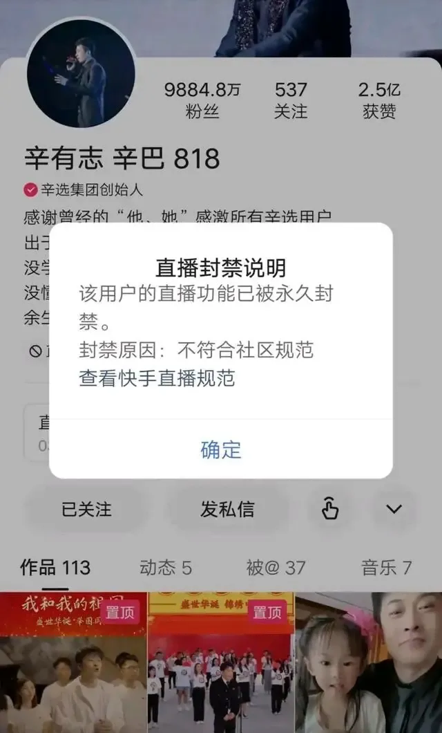 快手也是丝毫不惯着,直接封禁了辛巴主账号“辛有志”,辛巴又立即登录辛选旗下中小主播账号,但没过多久依旧被快手平台封禁。