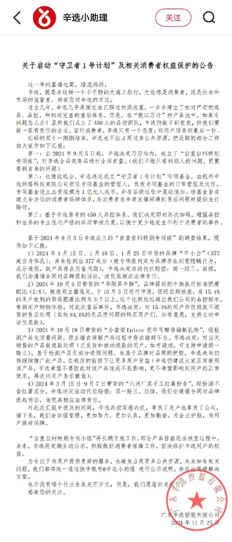 值得一提的是,在11月25日,白云区市场监管局决定对辛巴虚假宣传事件开始依法调查时,辛选集团也发布了《关于启动“守卫者1号计划”及相关消费者权益保护的公告》。这般立正挨打、自省自查的姿态有效缓和了事态的进一步发酵。