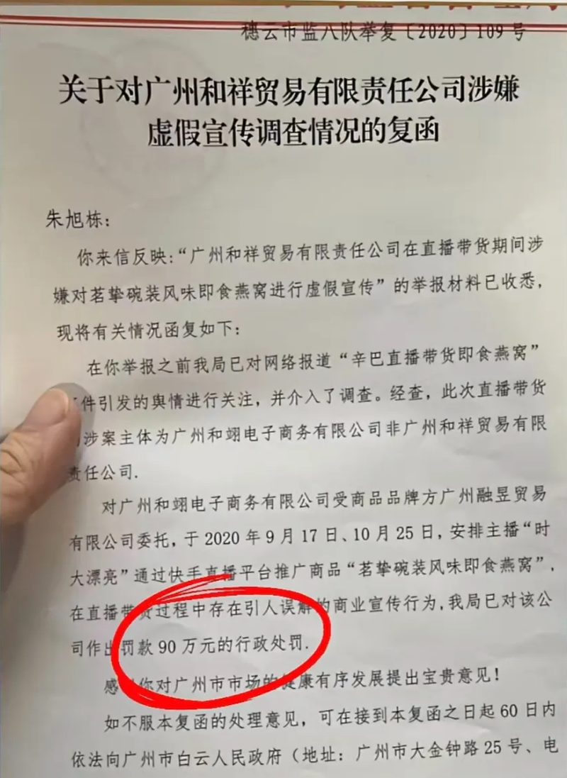 同时他晒出了辛巴赔付“糖水燕窝”的调查回复函,广州市白云区市监局称辛选接受了90万元的行政处罚,暗示公司承认了违法行为。