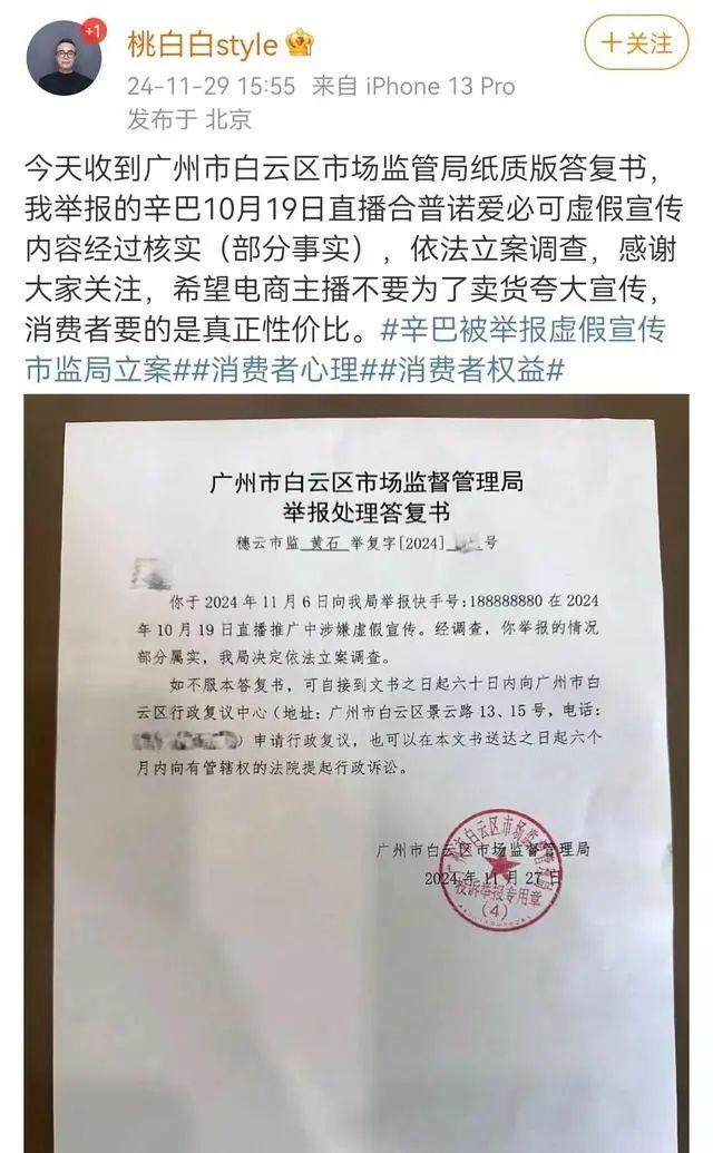 博主“桃白白style”则实名举报辛巴和徒弟蛋蛋直播间虚假宣传,称辛巴10月19日直播合普诺爱必可虚假宣传部分属实,依法立案调查。