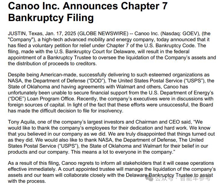 百亿造车巨头,破产清零了。造车8年,滑板底盘造车鼻祖Canoo,刚在主页更新了公告,宣告公司已申请破产,并立即停运。辉煌时,这家公司云集宝马、福特、Uber等巨头的前高管,仅4年就在纳斯达克上市,市值一度高达150亿。如今深陷泥沼,因融资失败而破产,随着9位创始人全部离去,Canoo的造车故事,自此遗憾画上句点。滑板底盘造车的故事,在美国遭受了重创。Canoo破产并立即停运还是没熬过。电动汽车公司Canoo刚发布了一条公告,宣告申请了美国破产法第7章,公司正式破产,并立即停止运营。其实在一个月前,Canoo的破产就有征兆。上个月18日,Canoo也发布了一则公告,宣布暂停位于俄克拉荷马州的工厂,并让82名员工“休假”,公司将全力筹集继续运营的资金。只是没想到,情况要比想象的更加危急。从公开数据来看,去年11月份,Canoo披露财报指标,公司去年第三季度营收90万美元(约659万元),同比增长71%,环比增长47%。营收额不高,但增长速度惊人,主要是因为Canoo其实2023年第三季度才开始有收入,甚至去年第一季度又“颗粒无收”。并且这是Canoo的首份盈利财报,净利润为325.8万美元(约2386.6万元),但前三季度的累计亏损仍有1.12亿美元(约8.2亿元)。最关键的是,截至季度末,Canoo账上的现金只剩下1600万美元,折合人民币大约是1.2亿元。短期内,如果不能获得足够的资金支持,Canoo将不得不接受破产的命运,但事实,恰恰就是他们最不想看到的那样。Canoo表示,由于未能获得美国能源部 (DOE) 贷款,与外国资本的谈判也没成功,公司资金链彻底断裂。事到如今,这家巅峰市值21亿美元(约154亿元)的造车新势力,最新股价只剩1.35美分,折合人民币连一毛钱都不到。滑板底盘鼻祖,造车这一路成立于2017年的Canoo,是滑板底盘赛道的代表性玩家。创始人斯特凡·克劳斯(Stefan Krause)和乌尔里希·克兰茨(Ulrich Kranz),都是车圈老炮,还都出身宝马。克劳斯擅长财务,曾经担任过宝马和德意志银行的首席财务官;克兰茨曾是宝马i3系列车型的项目主管,被称为“宝马i系列之父”。而且两人都曾是贾跃亭的手下干将,担任过法拉第未来(FF)的CFO和CTO。离开FF后,他们发现了滑板底盘的商机,一拍即合创立了Canoo。所谓滑板底盘,就是一种专门为电动车设计的一体化底盘架构,将电池、传动系统、悬架等汽车部件,直接整合到一个通用底盘上。其优势在于取消机械连接,车舱可以保留更多空间,而且同一个底盘,能够灵活适应不同大小的车辆类型,从而提升整个汽车产品系列的可扩展性。目前为止,Canoo推出的四个系列车型,就都是基于自研的滑板式底盘打造。一款是2019年面世的旗下首款电动车MPV,还有一款皮卡、一款轿车,以及生活方式送货车LDV。车造出来了,接下来该考虑的就是卖给谁。Canoo的商业模式,起初设想非常美好,他们计划兼顾2B和2C市场,3条腿走路:对于2B市场,一条线是与主机厂合作,直接为他们提供滑板底盘;另一条则是针对物流货运。而在2C市场,Canoo提出了一个全新玩法——订阅模式:消费者在Canoo官方平台申请车辆,之后按月付费使用Canoo的车辆,类似于“短租”。Canoo原本打算把这种模式当作主要的营收渠道,他们认为,既可以为消费者省去抵押、上牌等无形成本,公司也可以按需生产,降低制造成本,提升利润空间,岂不两全其美?怎料,现实却并没有想象中的顺利。主机厂普遍不太愿意把底盘业务交给别人,比如Canoo和现代汽车的合作项目,没多久就胎死腹中。同时创新性的订阅模式也没搞起来,Canoo一度吸金困难,恰逢此时,CEO乌尔里希·克兰茨,跳槽去了苹果拓展汽车业务,连带着一场小型离职潮在Canoo爆发。这种背景下,执行董事长托尼·阿奎拉(Tony Aquila),也是公司投资人,召开了分析师会议上,几乎推翻了此前所有的商业规划:把订阅模式的收入占比,压缩到20%以下,重心面向货运领域的2B市场。2022年,Canoo等到了一笔大单,沃尔玛宣布要购买4500辆Canoo LDV,用于配送在线订单。但这也是Canoo一直到现在为止的最大订单,虽然Canoo还得到了美国邮政局和NASA的订单支持,但两者加起来的数量也只是9辆,不足以帮助Canoo力挽狂澜,也没法规模化降本。如此,在接下来的几年,不仅是投资人逐渐失去信心,公司内部,曾经吸引来的创始高管,也都接连出走。到2024年9月,伴随着汽车工程高级总监,克里斯托夫·库特纳 (Christoph Kuttner) 的离职,当初的9位联合创始人已全部离开。Canoo已是形存神灭。滑板造车,还能玩下去吗?Canoo倒下,看起来像是对滑板底盘造车,再次敲响警钟。细想之下,Canoo这些问题的症结,都在齐齐指向商业模式。不单单是Canoo自身的商业模式,也是滑板式底盘赛道的商业模式。这个赛道第一个爆雷的Arrival,和Canoo类似,都走向了商用车路线,制造配送车、轻型货车卖给商超、物流商。这样的模式,要面临着逃不开的困局,首先是这样的客户订单总量不大,因此难以规模化降低成本。其次,滑板造车玩家并不提供自动驾驶技术,交付的车还是需要人类驾驶的车,但成本又远高于传统货车,愿意买账的人更加有限。第二条路线,就是更为知名的Rivian选择的,乘用车路线,并且Rivian更倾向于整车生产,滑板底盘更多是一个标签。不过,Rivian为了在北美市场活下来,首款产品几乎集全部资源押注了皮卡车型,竞争压力也可想而知。如今走下去,也需要源源不断的融资在后方燃烧,刚刚还向美国能源部申请了一笔66亿美元(约483亿元)的贷款。但如果