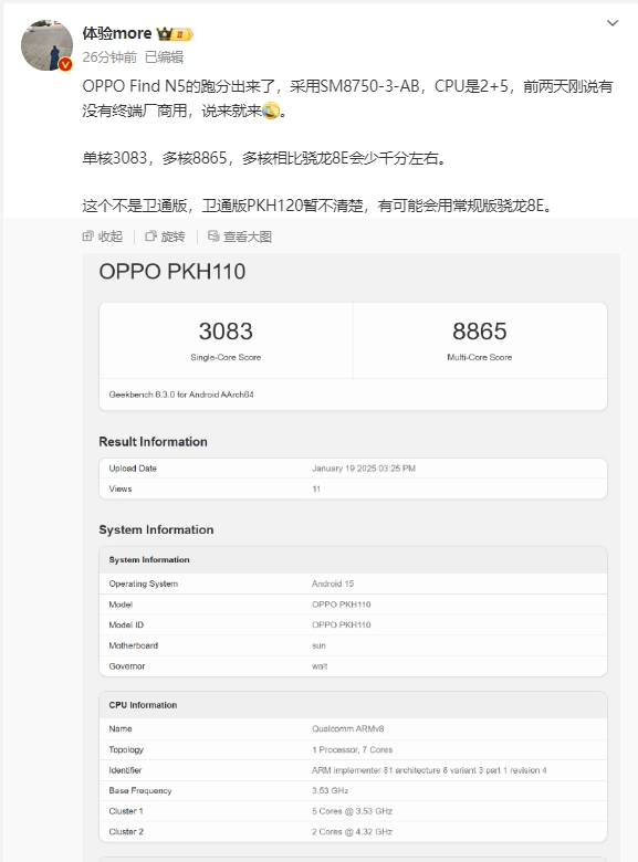 【CNMO科技消息】1月20日,CNMO注意到,OPPO Find N5现身Geekbench跑分平台,搭载了代号为SM8750-3-AB的处理器,其CPU核心配置为2个大核加5个小核。在跑分测试中,其单核成绩为3083,多核成绩为8865,相较于骁龙8 Elite的多核成绩略有降低,因此推测新机可能搭载的是骁龙8 Elite的“减配版”。需要注意的是,该版本并非卫通版,而关于卫通版PKH120的具体信息目前尚不清楚,但有可能会采用常规版的骁龙8 Elite。