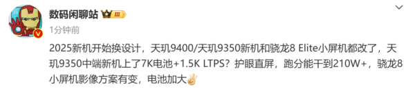 该博主发文称:“2025新机开始换设计,天玑9400/天玑9350新机和骁龙8 Elite小屏机都改了,天玑9350中端新机上了7K电池+1.5K LTPS护眼直屏,跑分能干到210W+,骁龙8小屏机影像方案有变,电池加大”。从其透露的信息来看,今年各家厂商依旧会在大电池上做文章,7000mAh大电池机型将会变得越来越多。即使是小屏旗舰机,电池容量也会进行加大,续航表现有望得到进一步增强。
