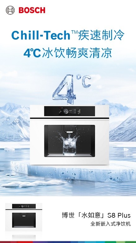 博世「水如意」S8 Plus嵌饮机搭载即热式Hi-Bolt™速热模块加热技术,3秒内即可将水温加热至所需温度,并且预设7种热水程序,可支持10个自定义程序,随时畅享温暖。同时,产品搭载全新Chill-Tech™冰水技术,通过高效压缩机制冷,冰水温度低至4℃3,单次出冰水量可达1.5L,搭配3档冰水温度(4°C,6°C,10°C)自由选择,疾速制冷,随时享受冰爽口感。无论是热饮还是冷饮,都能轻松满足,为消费者呈现理想温度与口感。