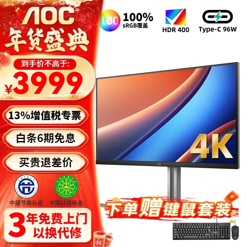 AOC U32U3显示器超值优惠!4K显示器仅售3901元