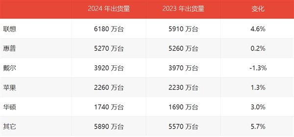 细分到厂商表现上,联想以4.6%的增长率继续领跑PC市场(出货量是6180万台),紧随其后的是惠普(5270万台,同比增长0.2%)、戴尔(出货3920万台,同比下滑1.3%)、苹果(出货量为2260万台,同比增长1.3%)和华硕(出货1740万台,同比增长3%)。