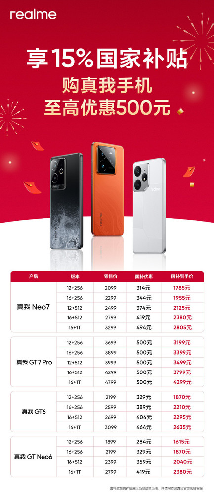 真我公布多款机型国补后价格 7000mAh手机仅1800元