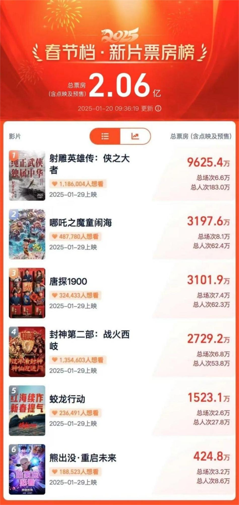 2025年春节档19日开启预售,短时间内预售总票房连破纪录,仅用时1小时40分钟,预售总票房突破3000万,不到3小时突破5000万。此外,《射雕英雄传:侠之大者》持续领跑春节档预售票房榜,《哪吒之魔童闹海》《唐探1900》暂列二、三位。