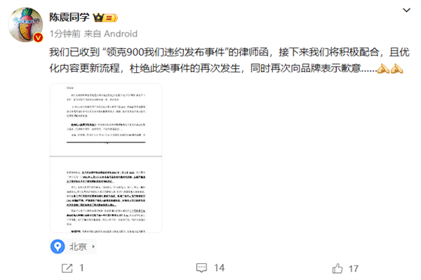 而后陈震多次公开致歉,称由于疏忽,给品牌方造成了很大的麻烦,事发第二天他还表示收到了领克索赔500万的律师函,并称接下来将积极配合,且优化内容更新流程,杜绝此类事件的再次发生。