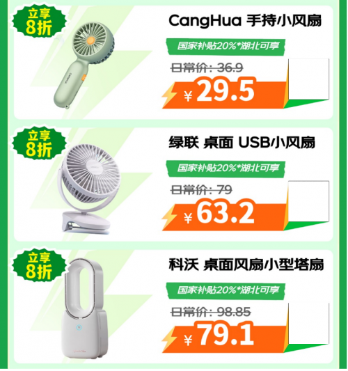 手动打扇嫌太累,不妨买个USB小风扇,省钱又省心,这次国家补贴的适用品类正好也包括了USB小风扇。CangHua手持小风扇使用国家补贴立享8折,到手只需29.5元。绿联桌面USB小风扇可享国家补贴8折优惠价63.2元,清风拂面吹散桌面热气。科沃桌面风扇小型塔扇,通过涡轮增压技术产生强劲风力,清凉自然,享国家补贴8折优惠价79.1元。
