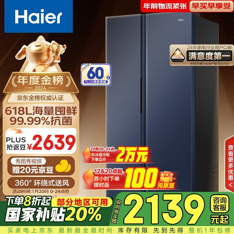 海尔星蕴系列对开门冰箱1939元 618升超大容量节能环保