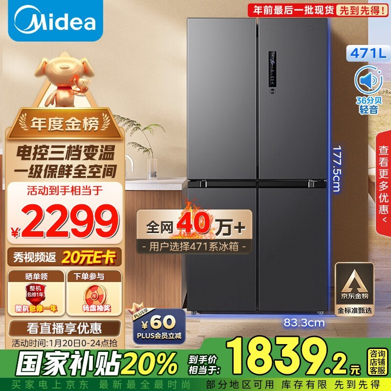 美的471升十字对开四开门电冰箱:1651元