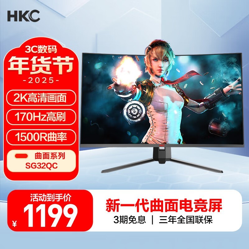 31.5寸显示器促销价1199元!HKC SG32QC显示器仅售1199元