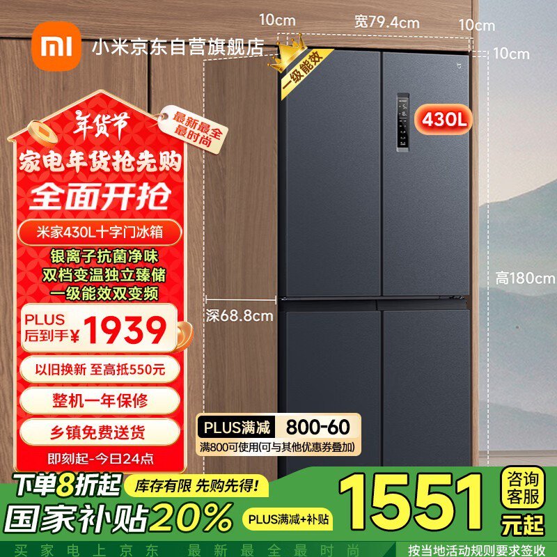 米家BCD-430WMSA十字对开门冰箱:节能环保,智能分区!
