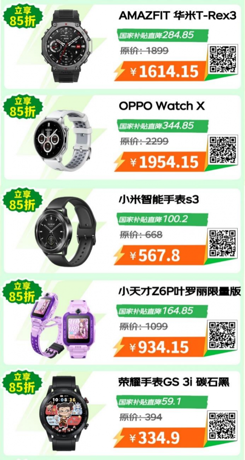 此外,还有各大品牌的智能手表在“国补”的支持下同享好物好价。拥有专业领跑模式的OPPO Watch X,原价2299元,“国补”后到手价1954.15元;拥有27天超长续航以及超全功能的AMAZFIT华米T-Rex3,原价1899元,“国补”后到手价1614.15元;小米智能手表S3,表现可圈可点,原价668元,“国补”后到手价567.8元。还有100种运动模式的荣耀手表GS 3i以及小朋友们超喜欢的小天才Z6P叶罗丽限量版,同享“国补”15%优惠,到手价分别为334.9元和934.15元。