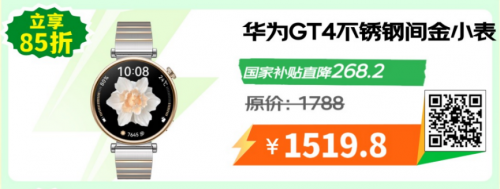 智能手表不仅仅性能强悍,多变的表带也让智能手表成为时尚穿搭的一部分。华为GT4,拥有简洁大气的圆形表盘和强烈的几何元素,配上绿色立体编织复合表带,适配各种风格穿搭,原价1288元,“国补”后到手价1094.8元;华为GT4不锈钢间金小表,独特间金工艺,质感高级,还有100+运动模式,健康状况也了如指掌。原价1788元,“国补”后到手价1519.8元。