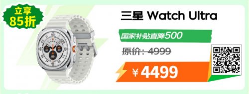 集通讯、健康监测、娱乐等多种功能于一身的智能手表,凭借卓越的性能和便捷的健康监测功能,已成为人们日常生活中不可或缺的时尚单品。三星 Watch Ultra专为冒险挑战而设计,可承受高达55℃的高温,10 ATM防水,IP68防尘,蓝宝石玻璃,坚固耐用。在Galaxy AI的赋能下,三星Galaxy Watch Ultra还能通过先进的传感器数据追踪帮助消费者从睡眠、运动和心率等不同维度了解身体状态及变化。原价4999元,国家补贴直降500元,到手价4499元。