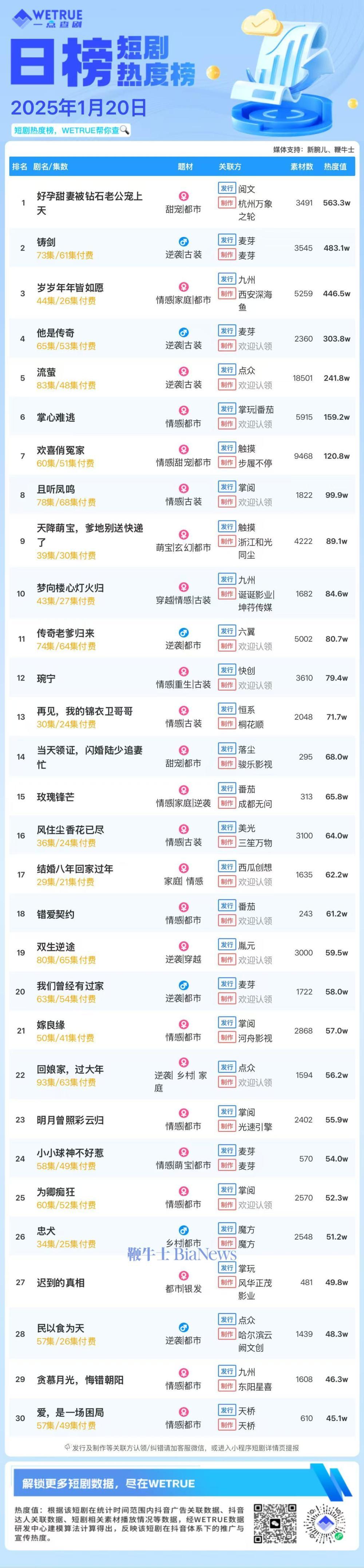 编者按:为帮助短剧从业者提供更多信息,专注于短剧报道的新腕儿和科技媒体鞭牛士联合WETRUE短剧热度榜共同推出短剧热度榜。