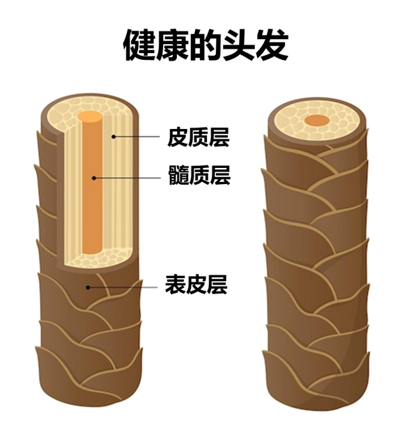 由上图可以看出,头发由外到内,分别由表皮层、皮质层和髓质层构成。