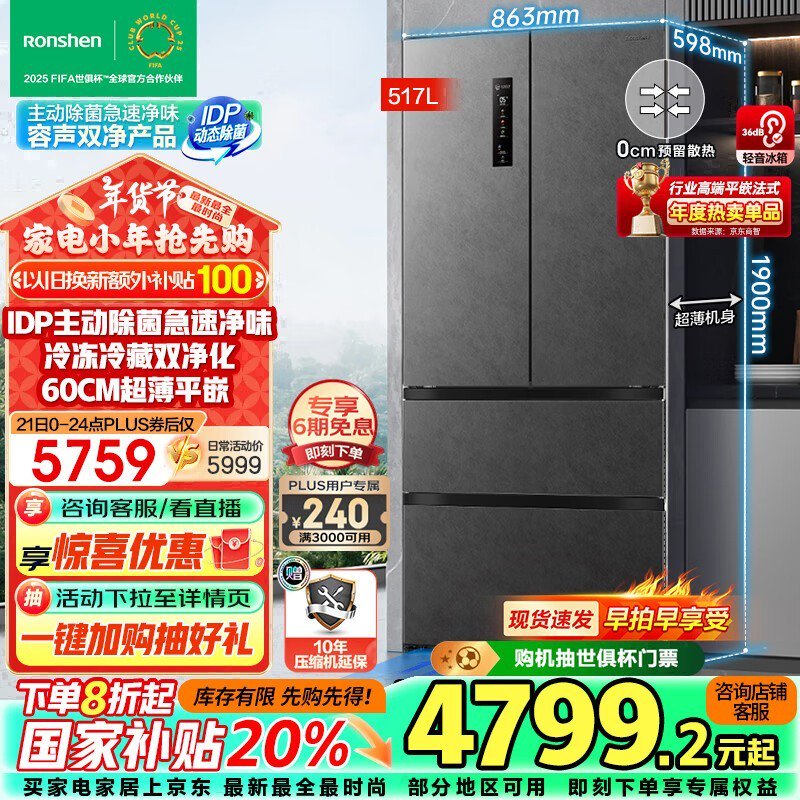 容声517升法式四开门冰箱限时4799元