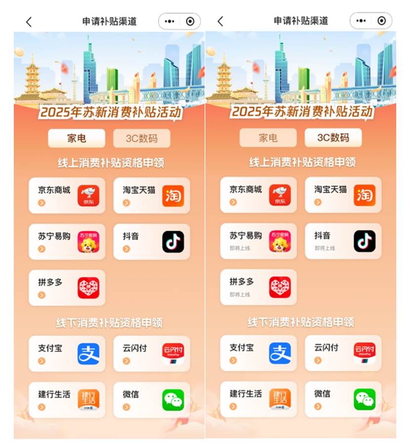 【3C补贴】线上补贴资格申领渠道有京东、天猫(其它平台将陆续上线);线下补贴资格申领渠道有:支付宝、云闪付、建行生活、微信支付。