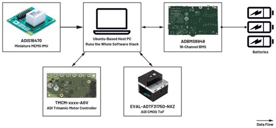 ADAM由ROS提供支持,并搭载ROS支持的不同组件。该平台展示了ADI的ROS驱动程序如何整合到移动机器人应用中,特别是自主导航应用。
